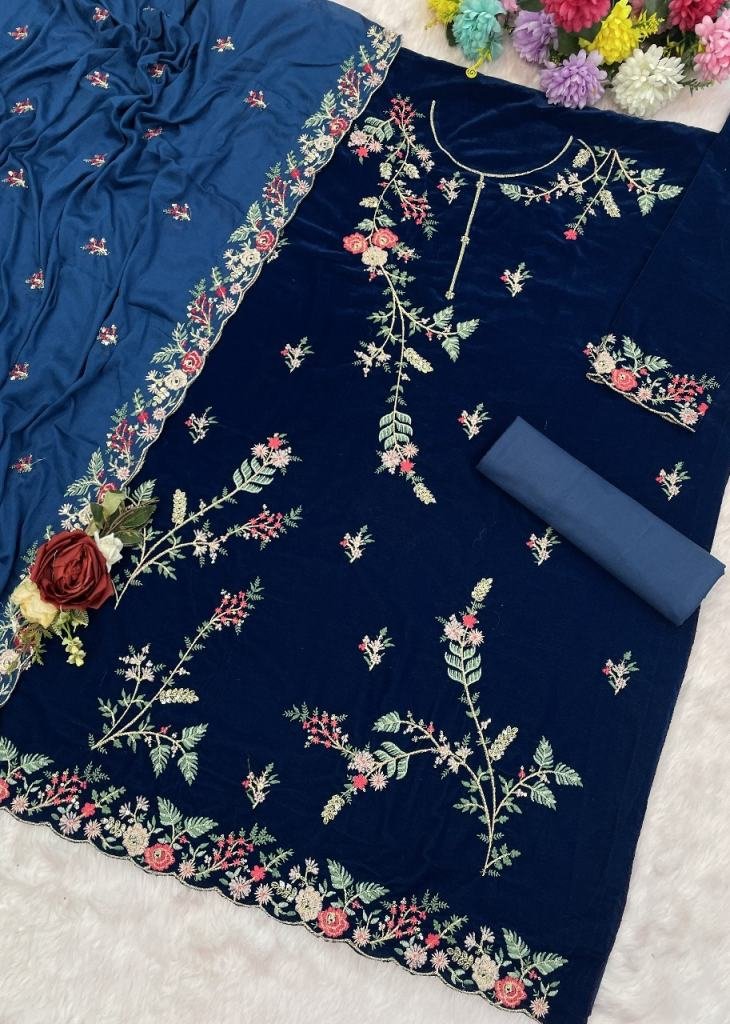 Winter Collection Velvet Salwar Suit With Multi Thread & Sequence Embroidery Work Dark Blue Color DN 1321