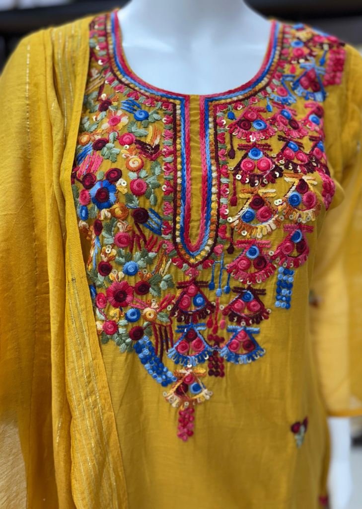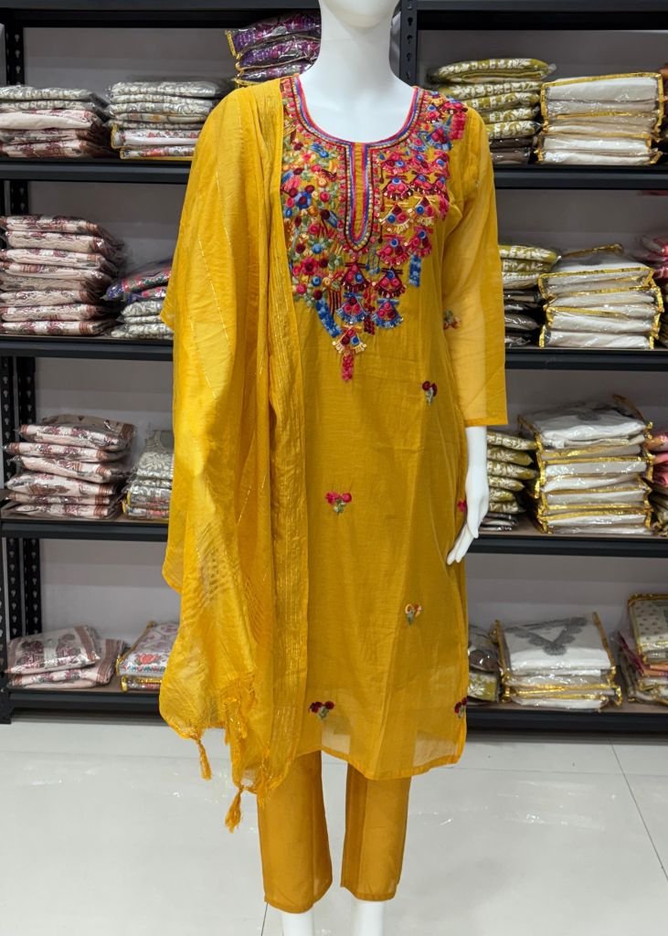 | NAME : | Women’s Kurti Pant Dupatta Set In Pure Natural Mul Chanderi Fabric And Hand Thread And Sequence Work Detailing Mustard Yellow Color DN 101 |