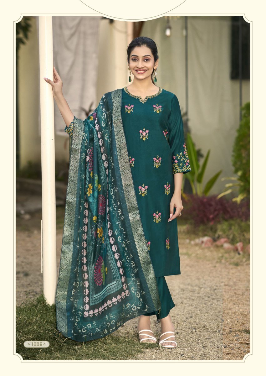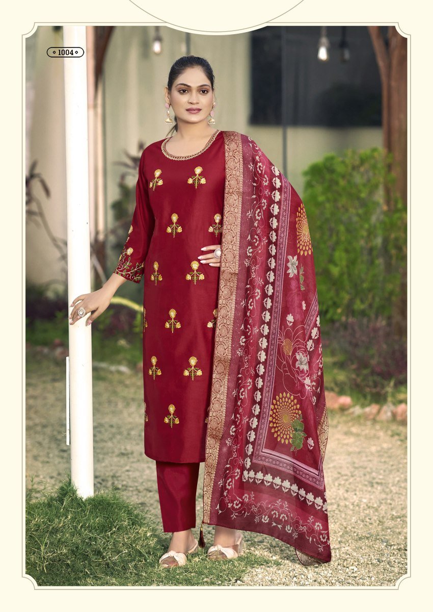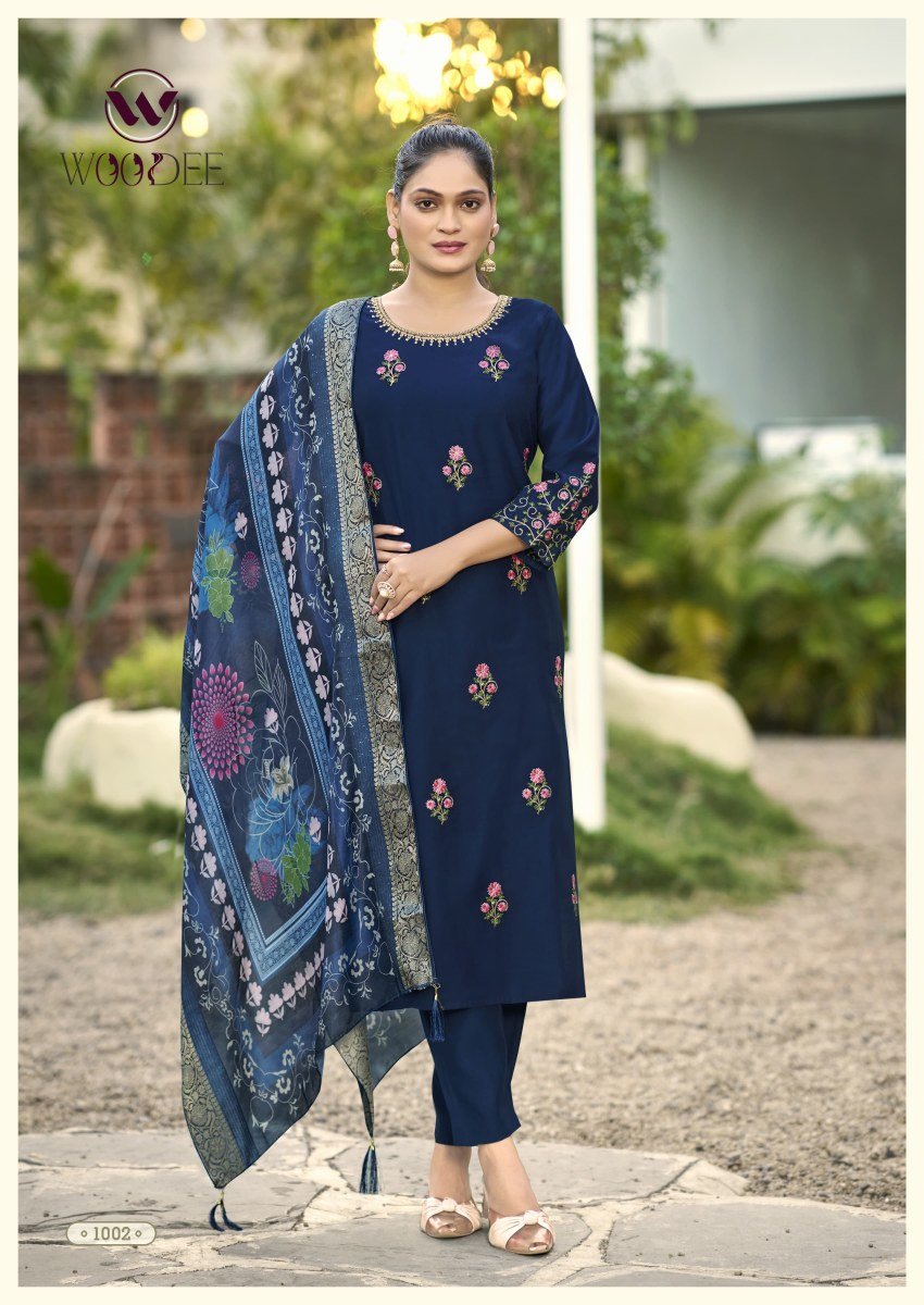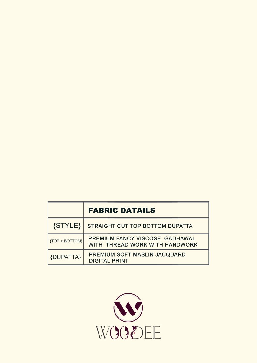 | NAME : | Woodee Himani Viscose Gadhwal Thread Work Top Bottom And Dupatta Kurti Set |